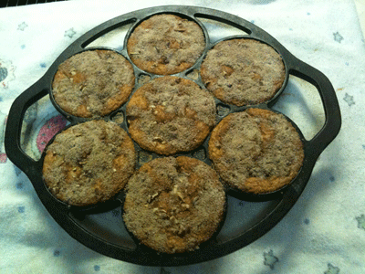 This is a quick camp recipe for the Lodge Drop Biscuit Pan. This recipes makes seven little individual crumb cakes.